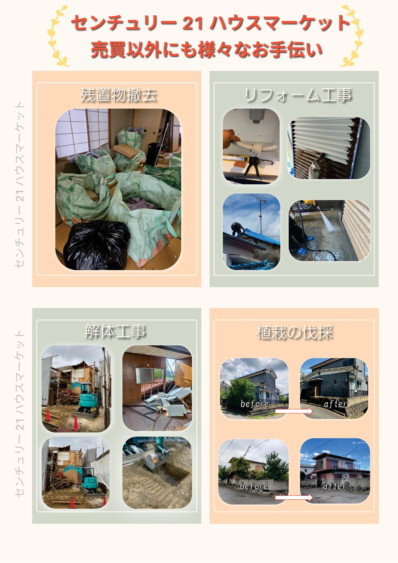 不動産を売却したいがどのようすればいいか分からない。そんな方の為に、不動産に関係する相続登記、測量業務、残置物撤去、植栽の伐採など多くのお手伝いが可能です。相続した物件で、家の状態も分からず売却に必要な物も分からないという方でもお気軽にご相談頂けます。