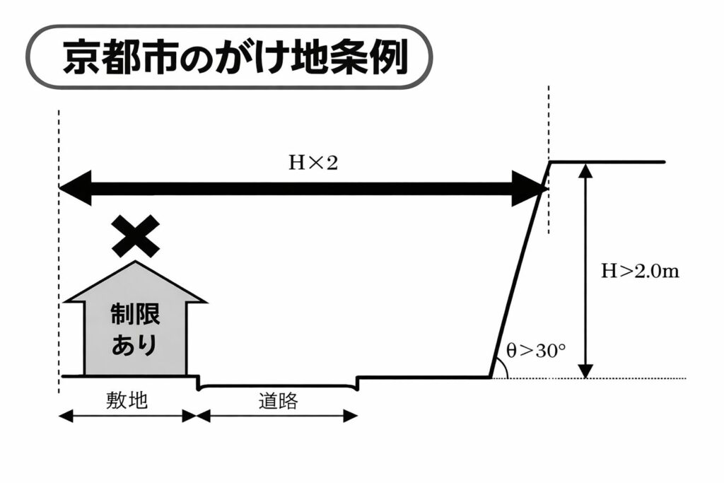 | ■がけ地条例とは がけ地条例とはがけ崩れ等の危険から建物を守るための規制です。 特に重要なポイントとして、 👉 がけの高さの約2倍の距離を離して建物を配置する必要がある ケースがあります 例: 擁壁の高さが5mの場合 → 約10mの後退が必要 このため、 ・建物の建替えができない ・大幅な配置制限がかかる | ■ 土砂災害警戒区域とは 土砂災害警戒区域とは、土砂崩れや地滑りのリスクがあると行政が指定したエリアです。 主に2つに分かれます: ・イエローゾーン(警戒区域) ・レッドゾーン(特別警戒区域) 特別警戒区域では、 ・建物構造の制限 ・新築・再建築時のハードル増加 |